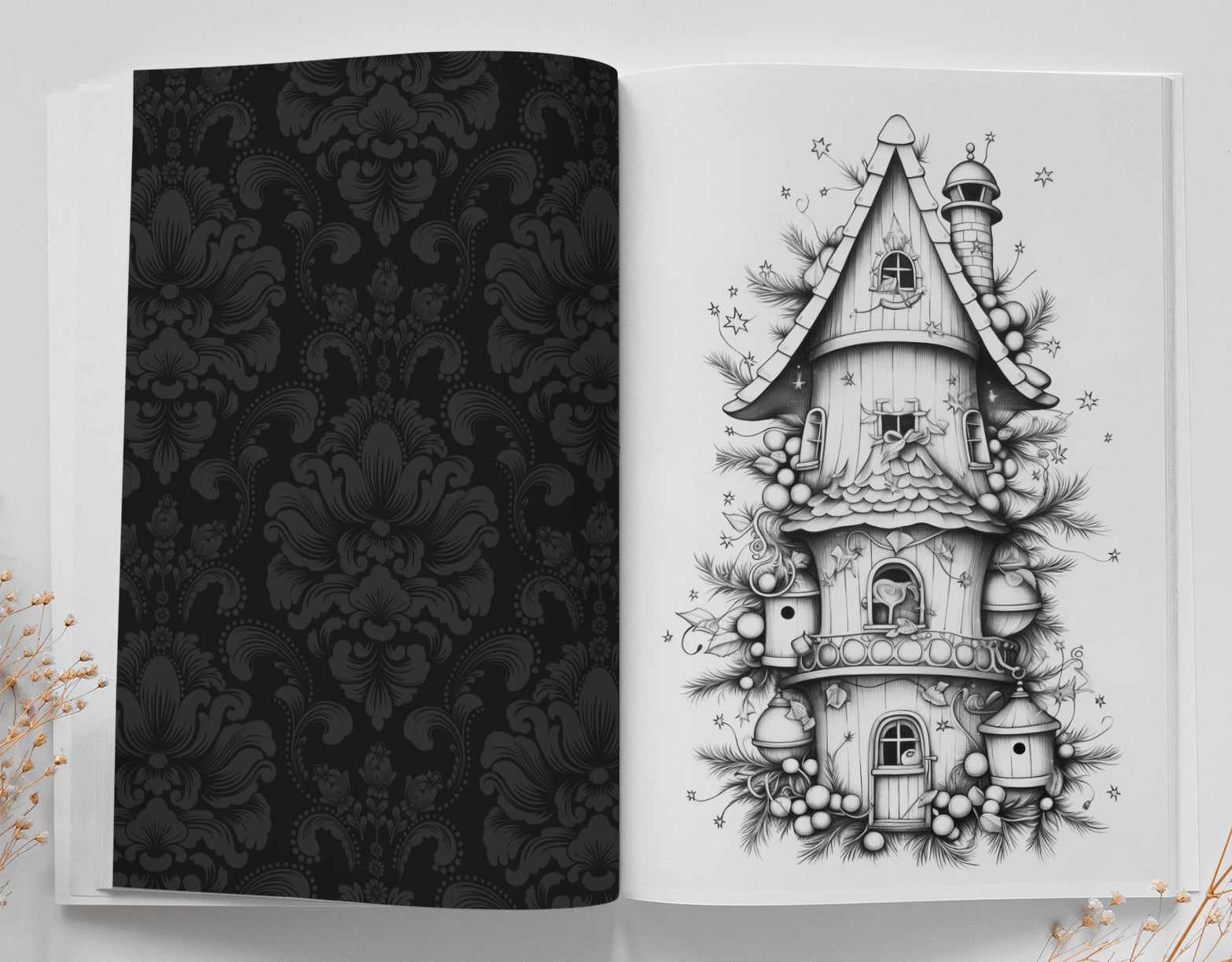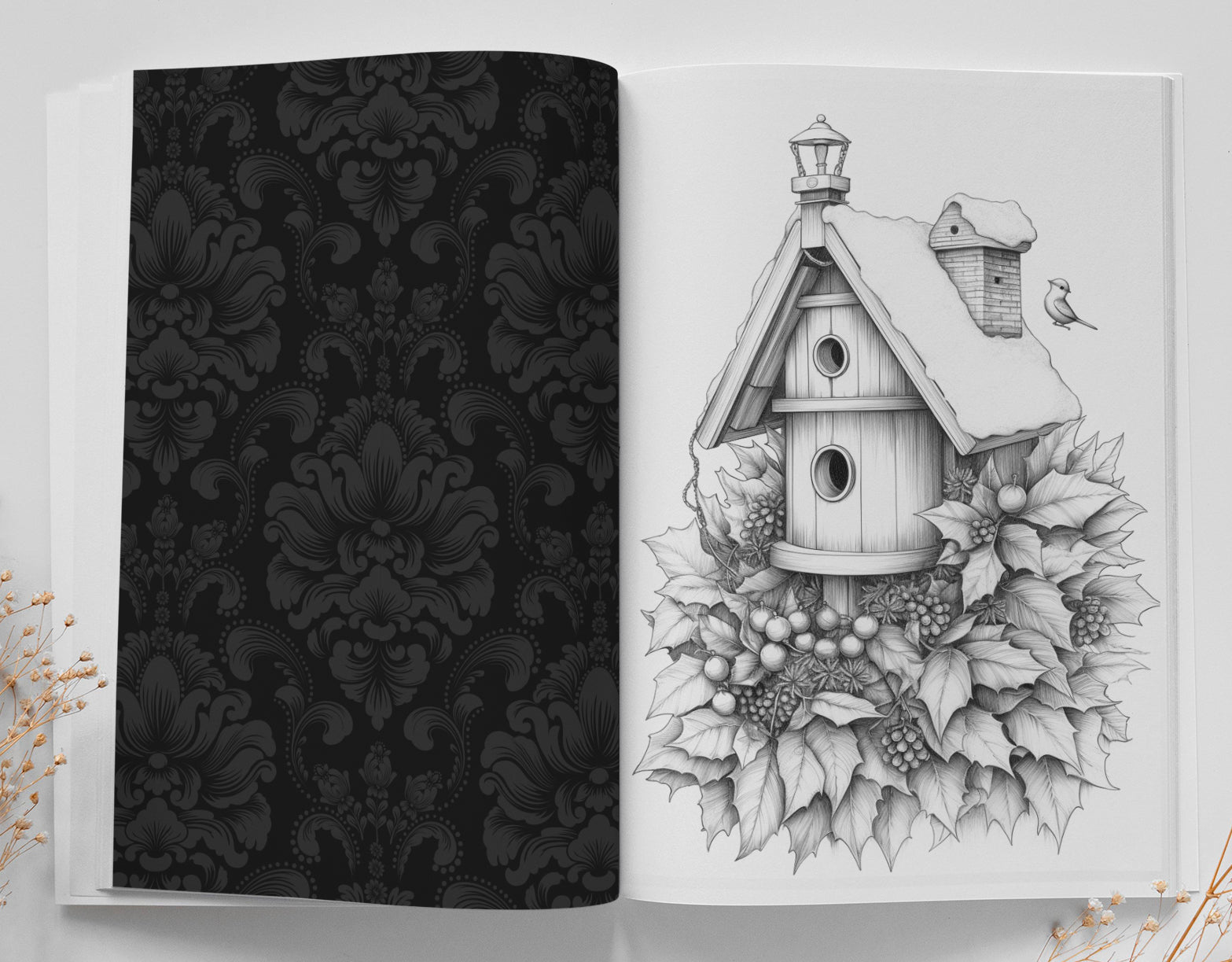 A wonderful coloring book with beautiful decorated Christmas Bird Houses