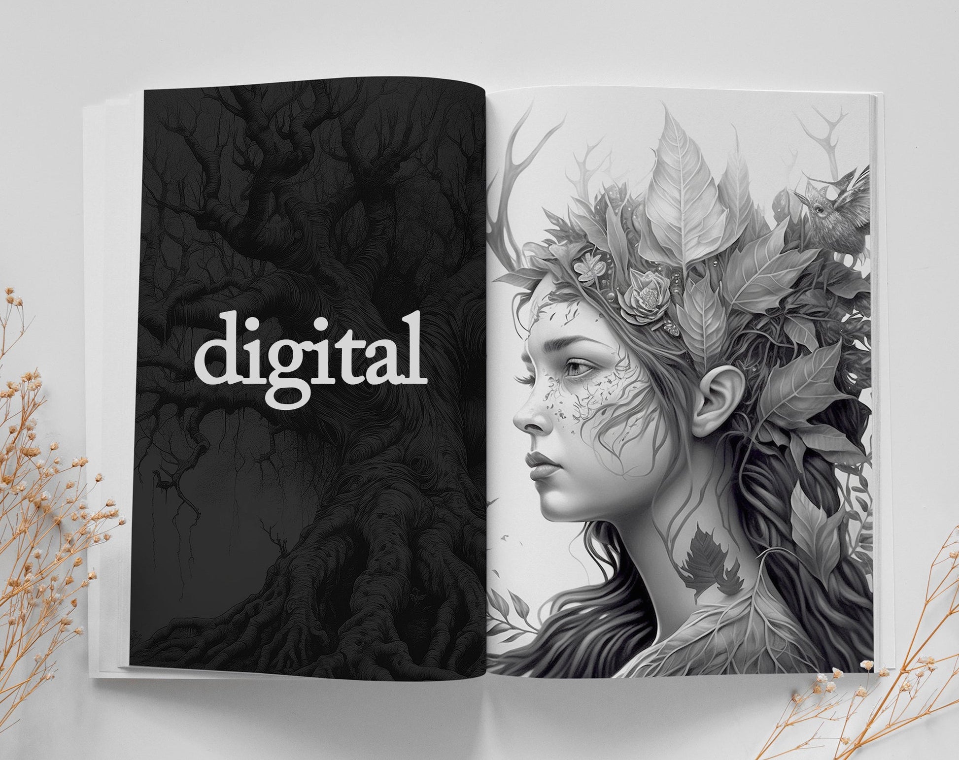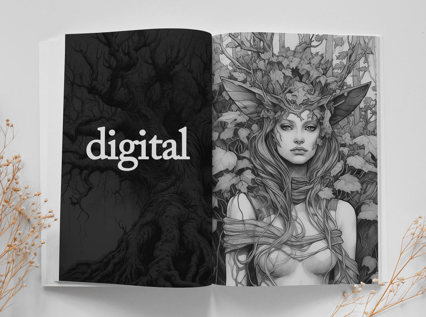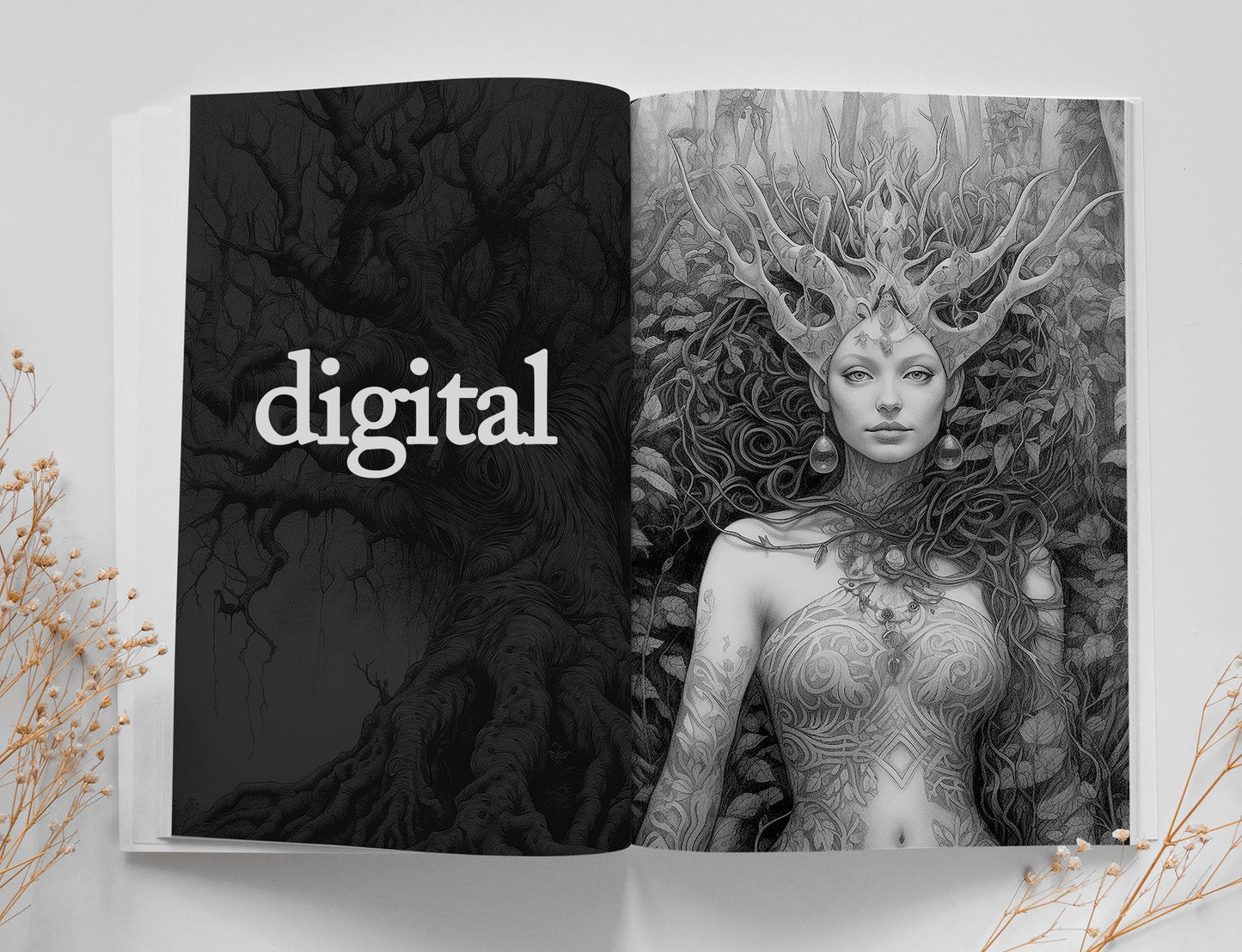 An outstanding grayscale coloring book for lovers of mystical forests and gods