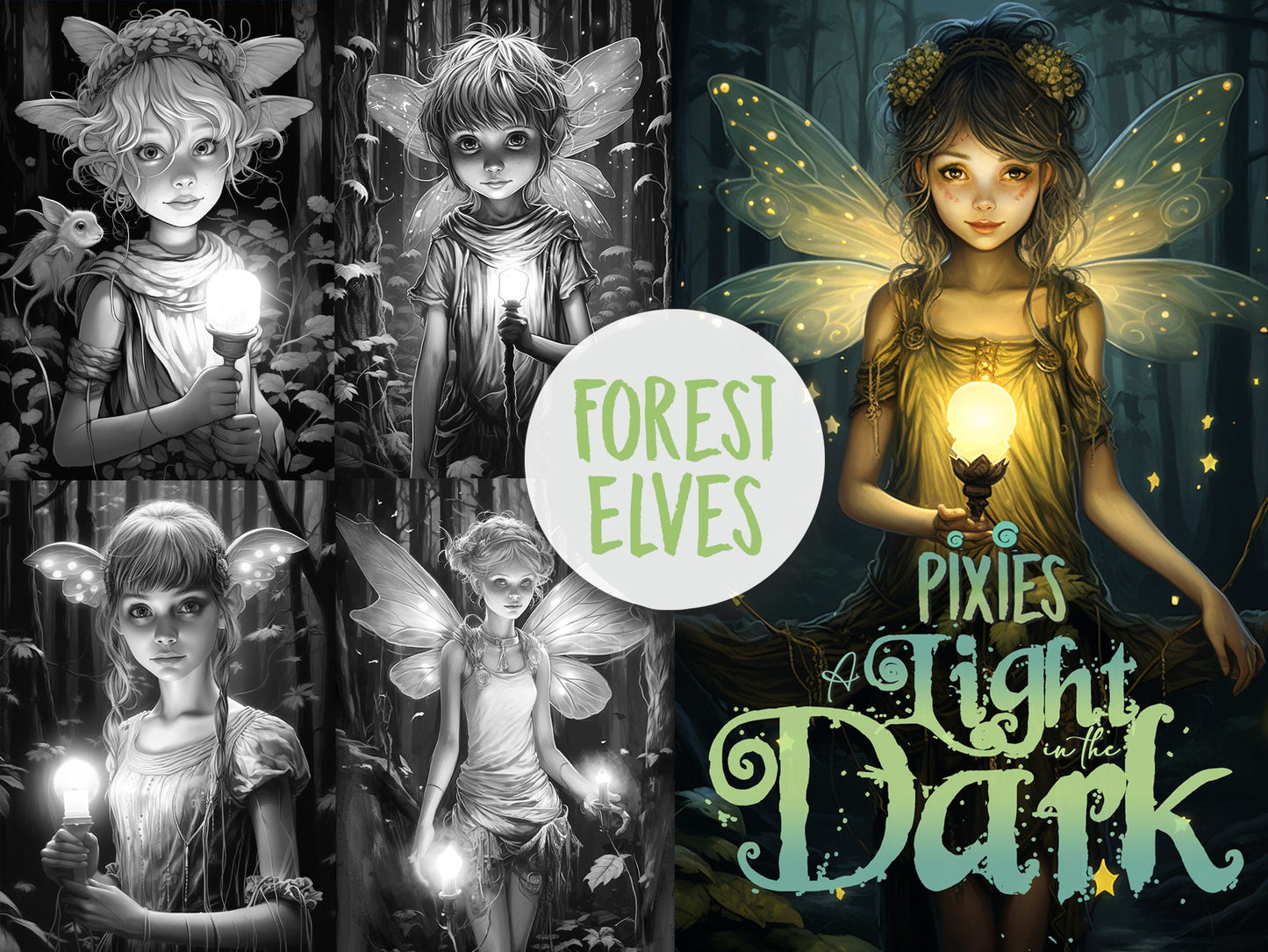 A wonderful coloring book with beautiful elves/pixies in the forest