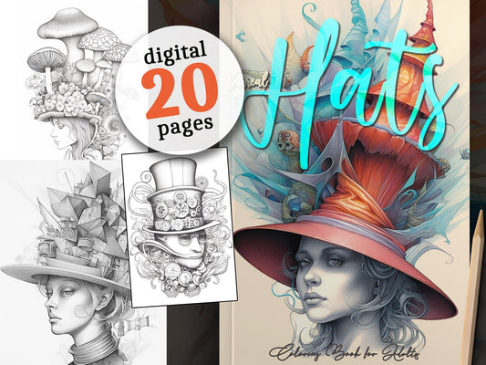 Surreal Hats Coloring Book Grayscale (Digital)
