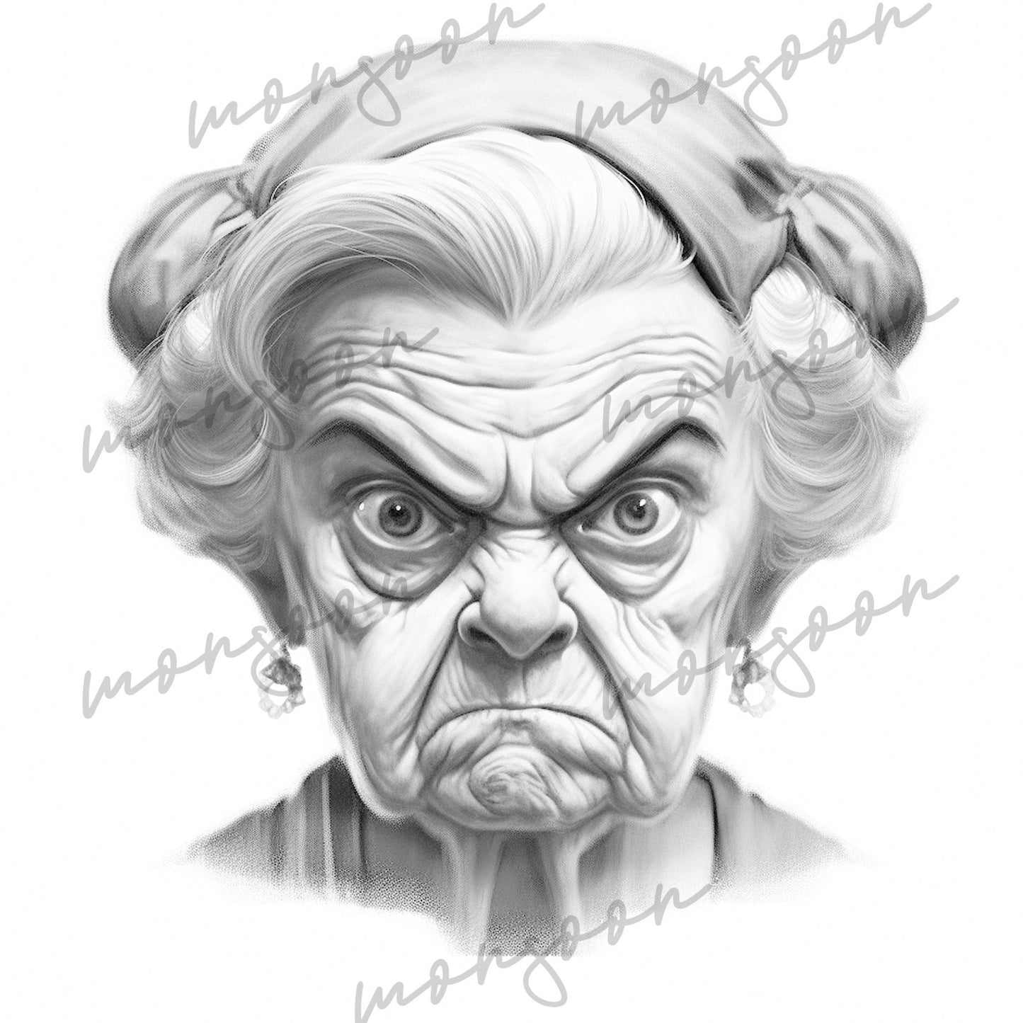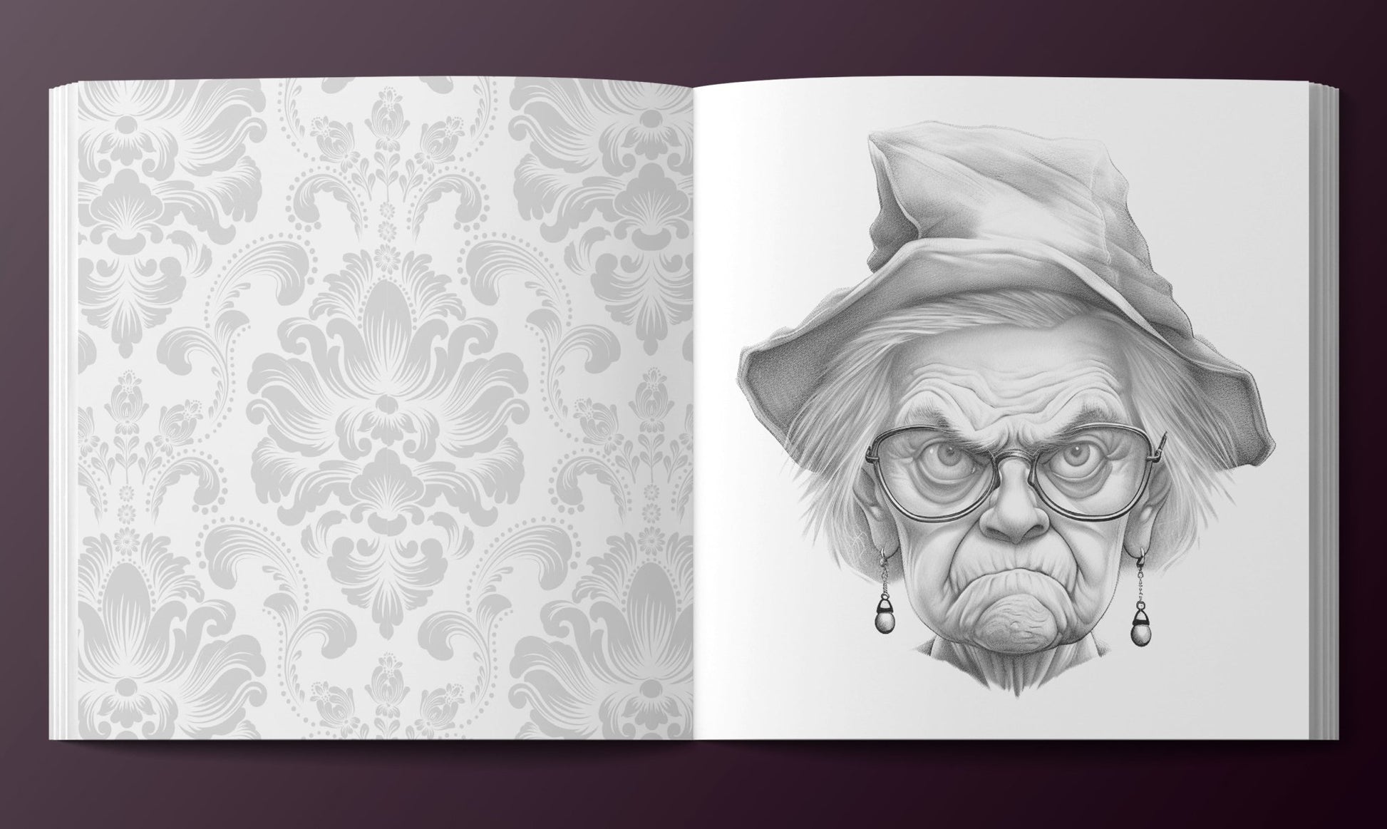 Grumpy Grandma Portrait Grayscale Cows Coloring Book