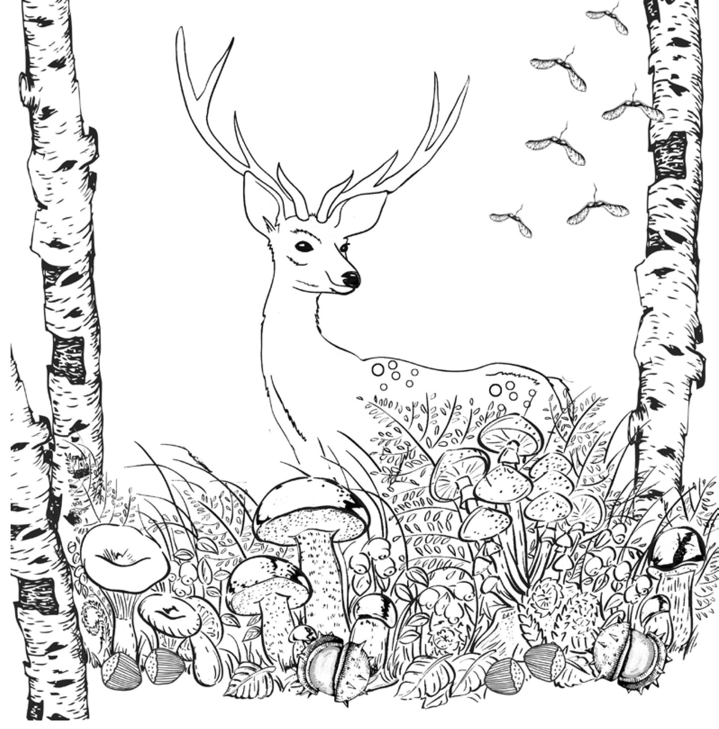The season of beautifully colored trees and leaves, nuts and chestnuts, mushrooms and deer, hedgehogs and raccoons. The coloring book takes you into this autumnal world full of colors.