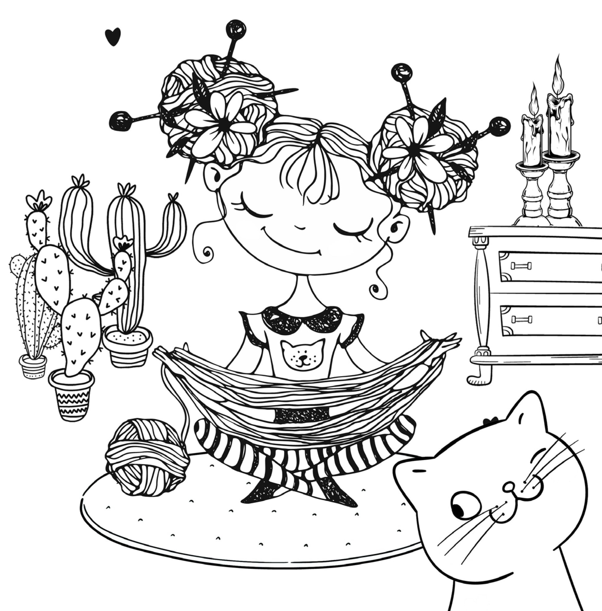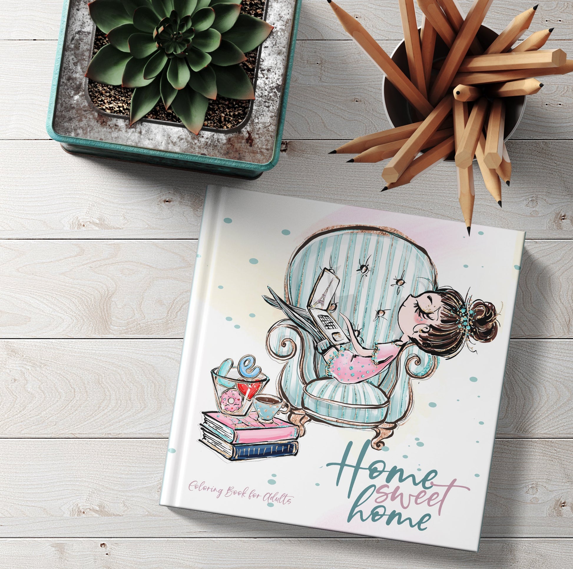 This lovely illustrated coloring book for adults shows everything we love at home: reading, sewing, baking, bathing, yoga, eating cake, drinking tea, partying, knitting, painting, being creative, cuddling with dogs and cats, look out of the window at a rainy day