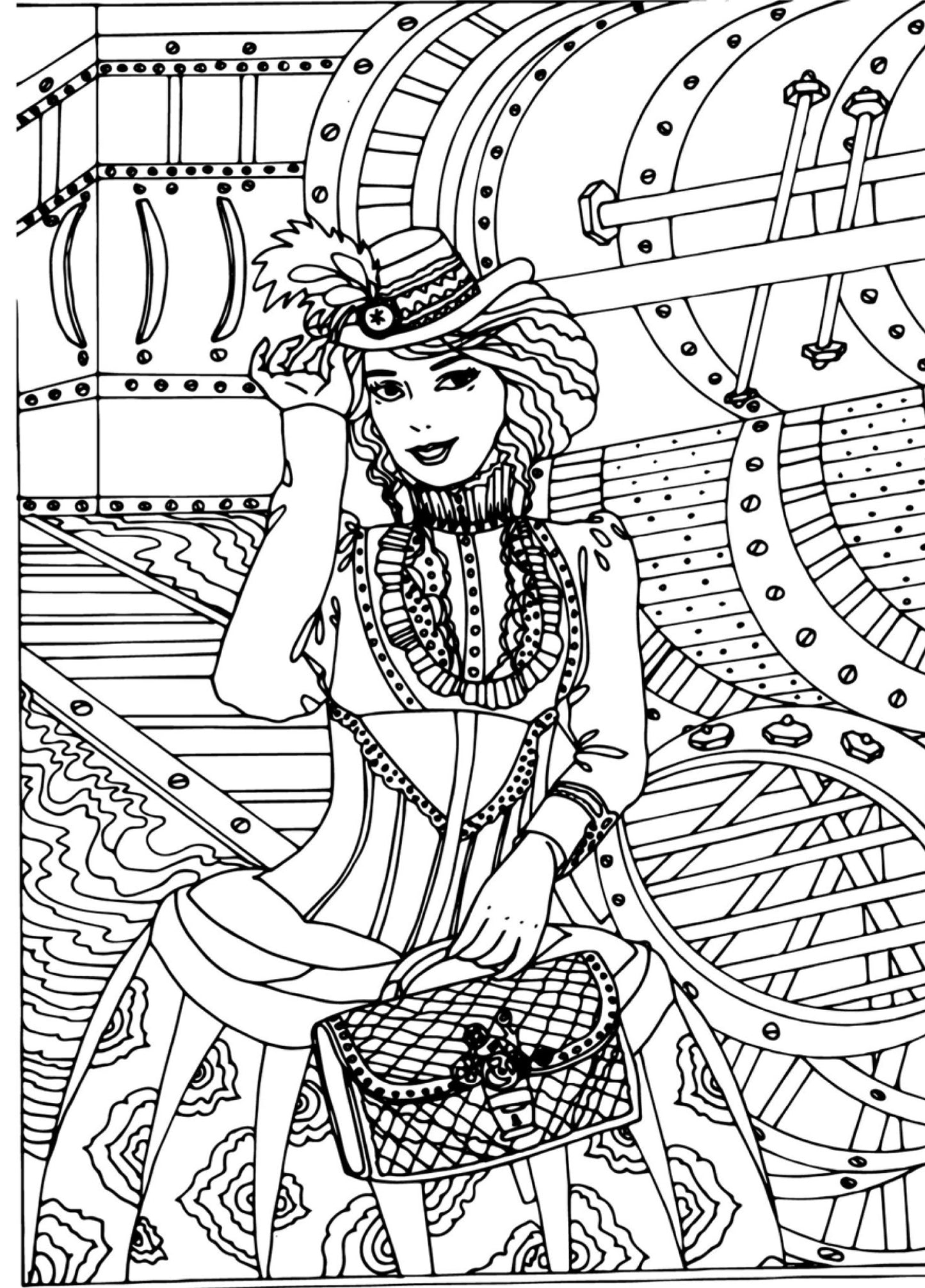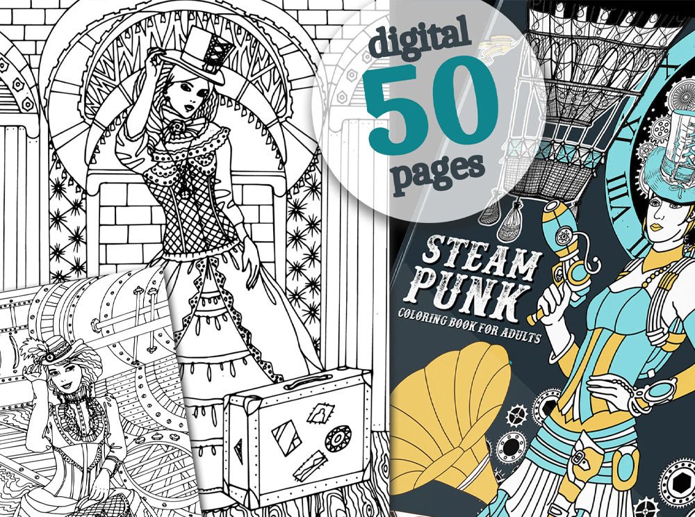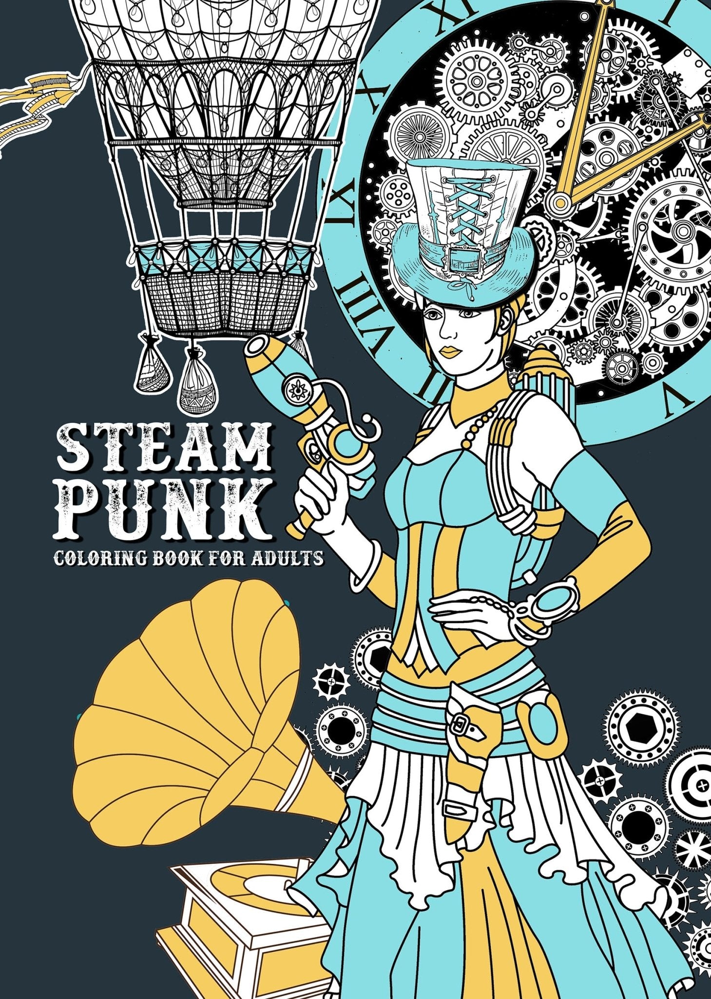 This Steampunk coloring book is full of futuristic fantasy, retro Ladies, engineer mechanical items.