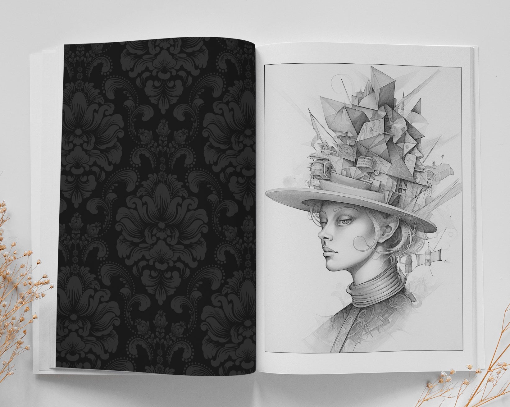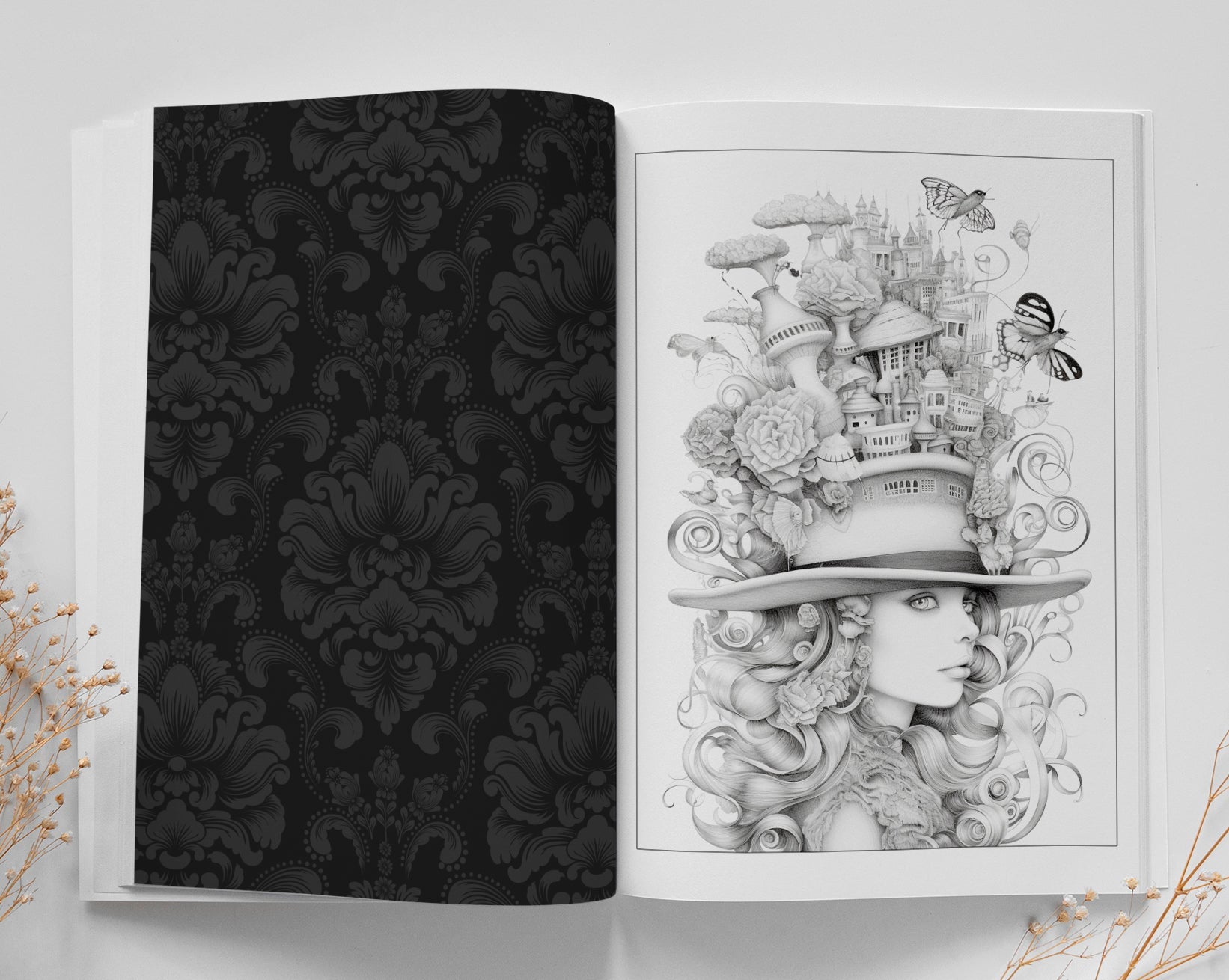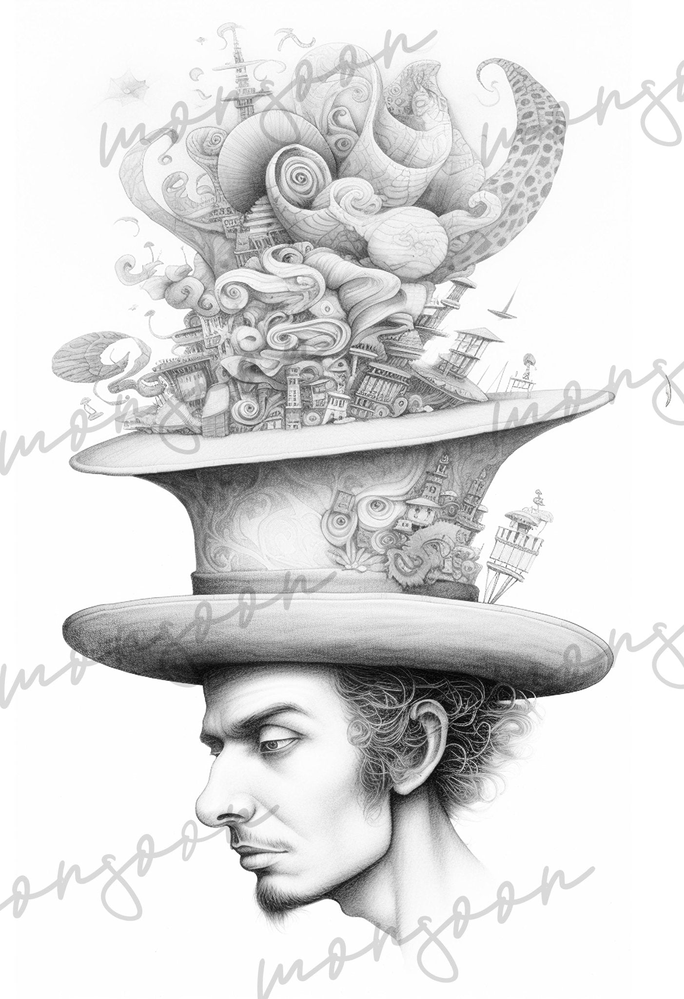 An outstanding grayscale coloring book for hat and surrealistic art fans