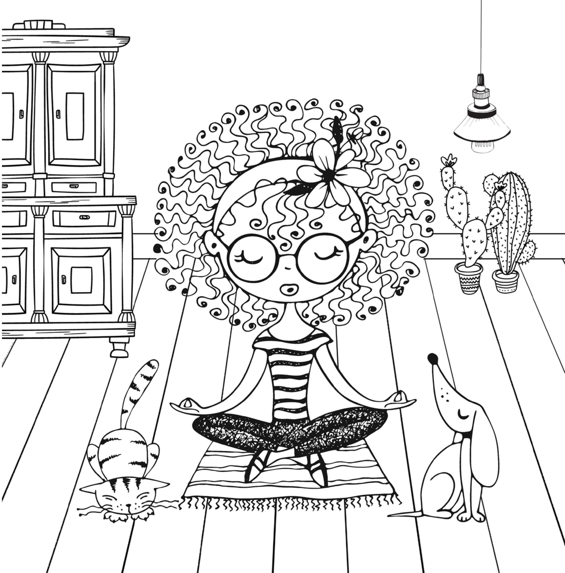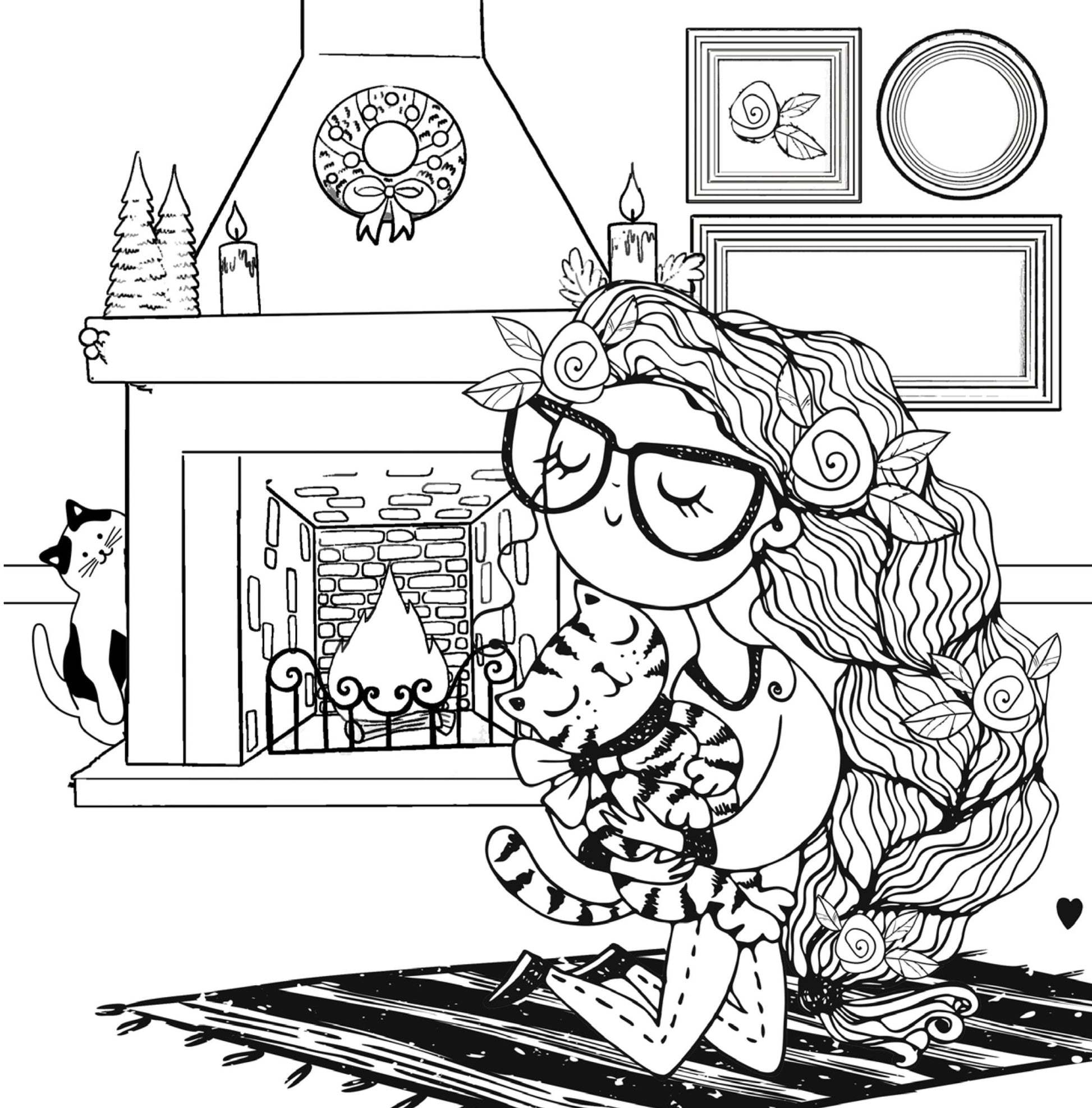 This lovely illustrated coloring book for adults shows everything we love at home: reading, sewing, baking, bathing, yoga, eating cake, drinking tea, partying, knitting, painting, being creative, cuddling with dogs and cats, look out of the window at a rainy day