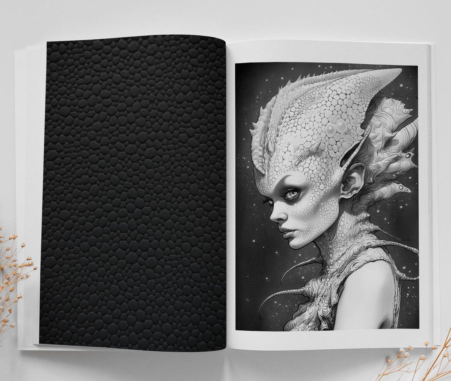 สมุดระบายสีที่มีรายละเอียดนี้เป็นของขวัญที่ยอดเยี่ยมสำหรับผู้ชื่นชอบแฟนตาซี เอเลี่ยน และจักรวาล